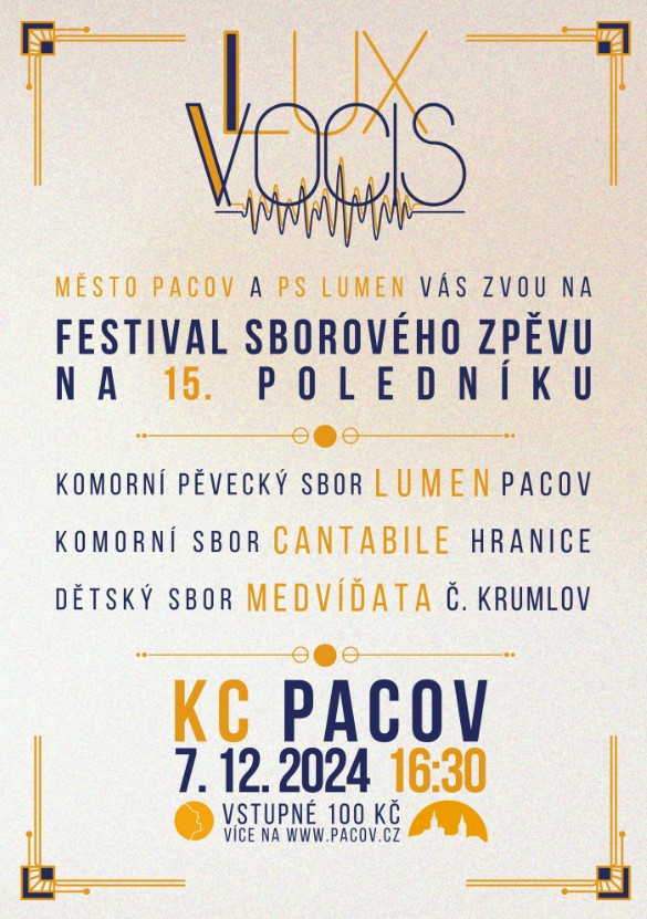 Lux Vocis – Světlo Hlasu je název nově vzniklého pacovského festivalu sborové hudby, který je zaměřen na adventní tvorbu. Již dlouho je ambicí organizátorů tohoto festivalu – pěveckého sboru Lumen – přinášet světlo svým posluchačům. A protože světla není nikdy dost, rozhodli jsme se každoročně zvát do Pacova ty nejlepší české sbory, které dokáží jedinečným způsobem rozzářit vaše adventní dny. Letos se nám povedlo připravit ročník pod záštitou Města Pacov, které nám tak poskytlo prostory KC.