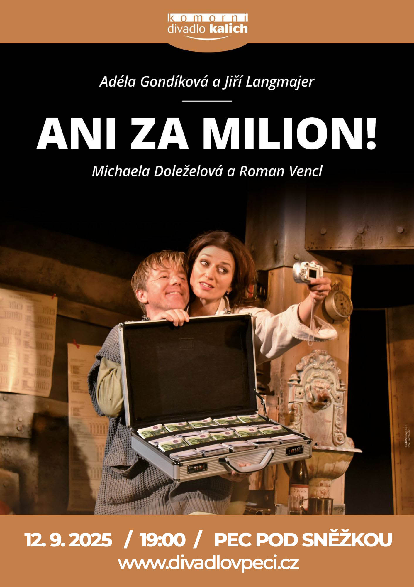 Divadlo v Peci uvádí detektivní komedii s Adélou Gondíkovou a Jiřím Langmajerem - Ani za milion. Open Air divadlo v krásném prostředí.