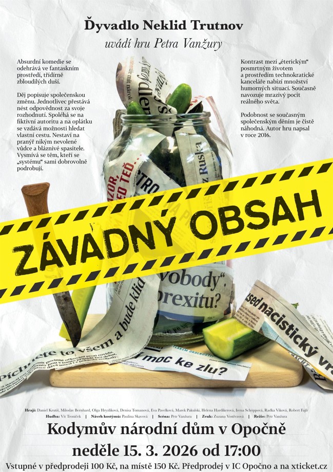 Srdečně vás zveme na originální a absurdní komedii Závadný obsah, kterou uvádí Ďyvadlo Neklid Trutnov. Hra autora Petra Vanžury vás zavede do fantastického prostředí plného chaotických rozhodnutí, nadsázky a bizarních situací, které až znepokojivě připomínají náš současný svět.