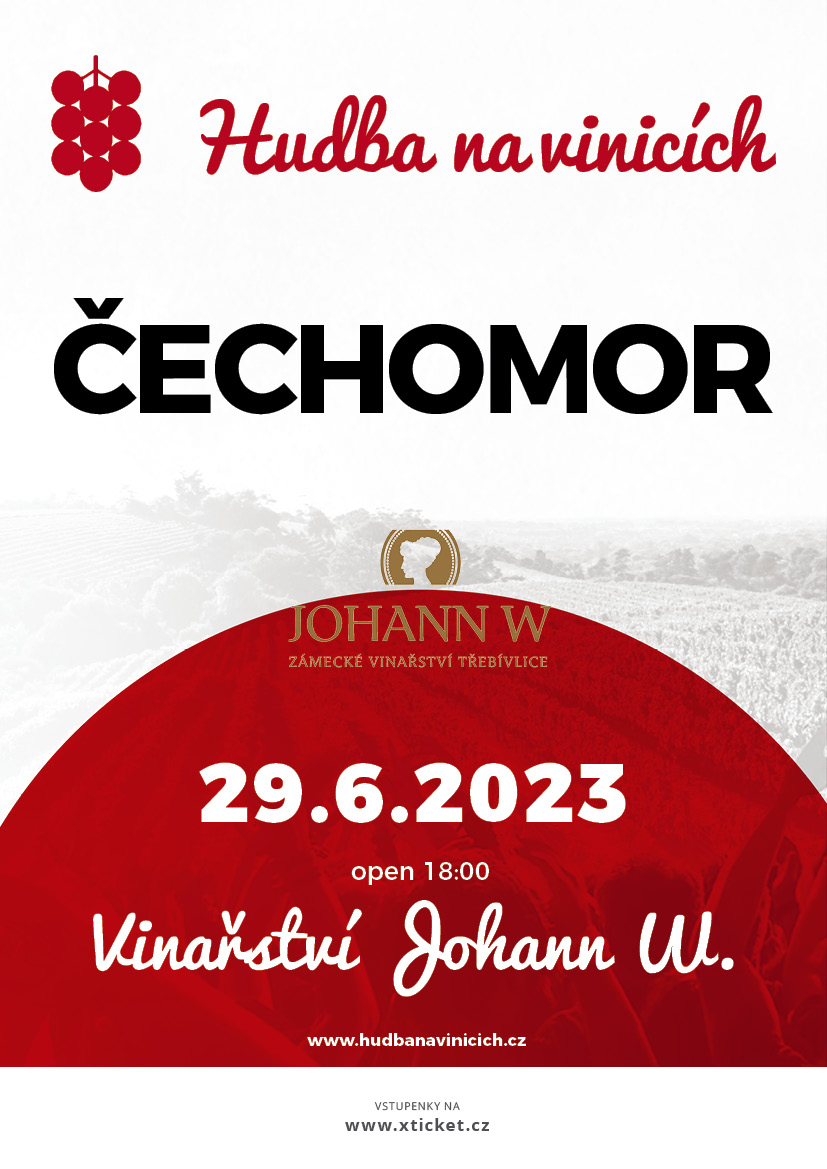 Hudba na vinicích spojí už počtvrté kvalitní živou hudbu, sklenku dobrého vína a malebné prostředí vinic. Česko-moravská hudební skupina ČECHOMOR originálním způsobem zpracovává lidové písně a na scéně působí již přes 30 let. Skupina úspěšně koncertovala v Evropě, Severní Americe, Rusku, Číně, Mongolsku a Austrálii. Natočila přes 20 alb, spolupracovala s řadou významných umělců a své hity zahraje a zazpívá i v rámci Hudby na vinicích 2023 ve vinařství Lahoferu, ve vinařství Johann W v Třebívlicích, ve vinařství Zlomek & Vávra Boršice a ve vinařství Sonberk v popicích na Moravě. Show odstartuje v 20.00 hod. Jednotlivé lokality nabízí řadu tipů na výlety i gastronomii, poskytují pestré možnosti ubytování a dalších služeb. Sledujte naše sociální sítě a webové stránky, abyste nezmeškali žádné novinky ohledně lineupu, lístků a exkluzivních soutěží. Bude to neuvěřitelný zážitek a my se nemůžeme dočkat, až ho budeme sdílet s vámi! Více informací na webu www.hudbanavinicich.cz.