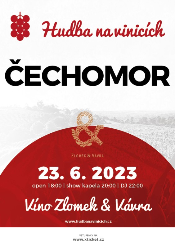 Hudba na vinicích spojí už počtvrté kvalitní živou hudbu, sklenku dobrého vína a malebné prostředí vinic. Česko-moravská hudební skupina ČECHOMOR originálním způsobem zpracovává lidové písně a na scéně působí již přes 30 let. Skupina úspěšně koncertovala v Evropě, Severní Americe, Rusku, Číně, Mongolsku a Austrálii. Natočila přes 20 alb, spolupracovala s řadou významných umělců a své hity zahraje a zazpívá i v rámci Hudby na vinicích 2023 ve vinařství Lahoferu, ve vinařství Johann W v Třebívlicích, ve vinařství Zlomek & Vávra Boršice a ve vinařství Sonberk v popicích na Moravě. Show odstartuje v 20.00 hod. Jednotlivé lokality nabízí řadu tipů na výlety i gastronomii, poskytují pestré možnosti ubytování a dalších služeb. Sledujte naše sociální sítě a webové stránky, abyste nezmeškali žádné novinky ohledně lineupu, lístků a exkluzivních soutěží. Bude to neuvěřitelný zážitek a my se nemůžeme dočkat, až ho budeme sdílet s vámi! Více informací na webu www.hudbanavinicich.cz.