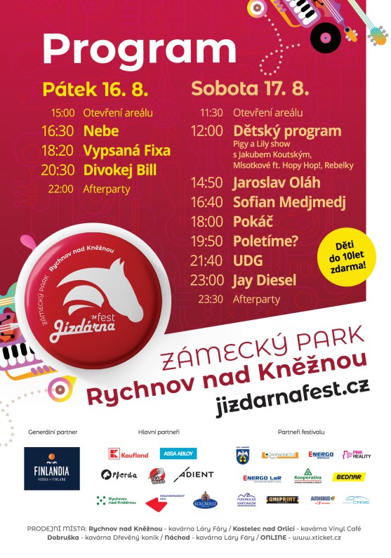 Šestý ročník festivalu Jízdárna Festu proběhne opět v krásném prostředí zámeckého parku v Rychnově nad Kněžnou 16. - 17. 8. 2024 a bude opět v plné parádě! Potvrzené kapely: DIVOKEJ BILL, POKÁČ, UDG, VYPSANÁ FIXA, SOFIAN MEDJMEDJ, JAY DIESEL, JAROSLAV OLAH, NEBE a POLETÍME?. Opět vás čeká dvoudenní hudební festival pro celou rodinu. Kromě hudebních vystoupení populárních kapel, je to především víkend plný aktivit a zážitků. Dílničky, workshopy, setkání s kapelami, soutěže, tombola ale především pohoda, krásné prostředí a další kupa radovánek. Nebude chybět ani dětský program. I letos bude pro děti v parku připravená stezka s úkoly a odměnami, skákací hrady, 3D realita a spousty další zábavy.