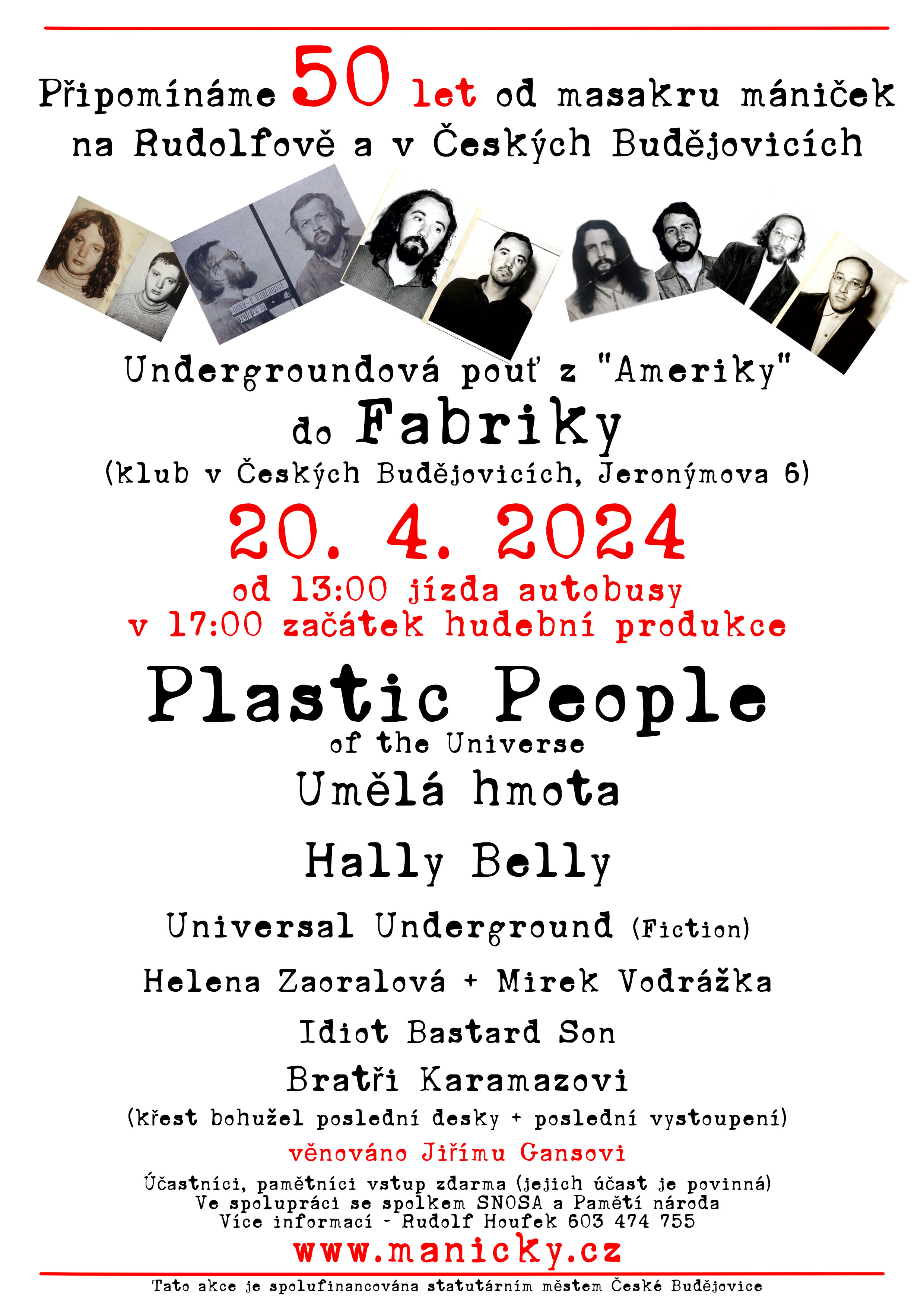 Připojte se ke vzpomínkové akci k 50. výročí zásahu proti fanouškům undergroundové hudby v Rudolfově. Připomeňme si společně statečnost těch, kdo se tehdy postavili proti represím, a oslavme ducha svobody, který tento incident odkazuje budoucím generacím. Program zahrnuje nejen nostalgickou jízdu historickými autobusy z Českých Budějovic do Rudolfova, ale také vystoupení legendární kapely The Plastic People of the Universe, která zde měla hrát i před 50 lety. Tato unikátní událost nám připomene atmosféru doby a umožní prožít část historie spolu s hudbou, která byla svého času symbolem odporu. Přijďte uctít památku těch, kteří se postavili proti nespravedlnosti, a znovu prožít momenty, které formovaly naši historii.