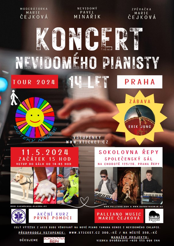 Zveme Vás na ROCKOVÝ KONCERT nevidomého pianisty, chlapce 14 let PALLIANO se zpěvačkou Marií Čejkovou z ČEJKA BANDU a na vzdělávací program - akční kurz první pomoci se Záchrannou službou MDT.