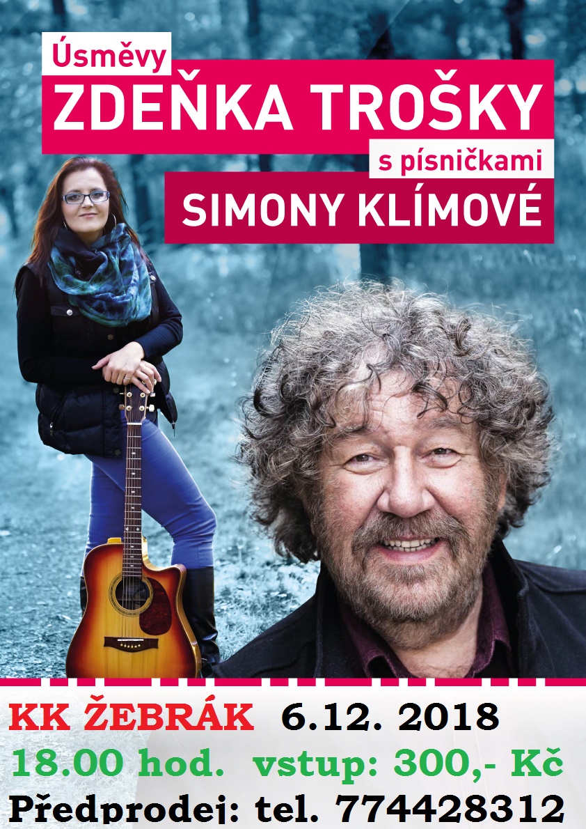 Úsměvy Zdeňka Trošky s písničkami Simony Klímové v KK Žebrák. V předprodeji 250 Kč. Na místě 300 Kč.