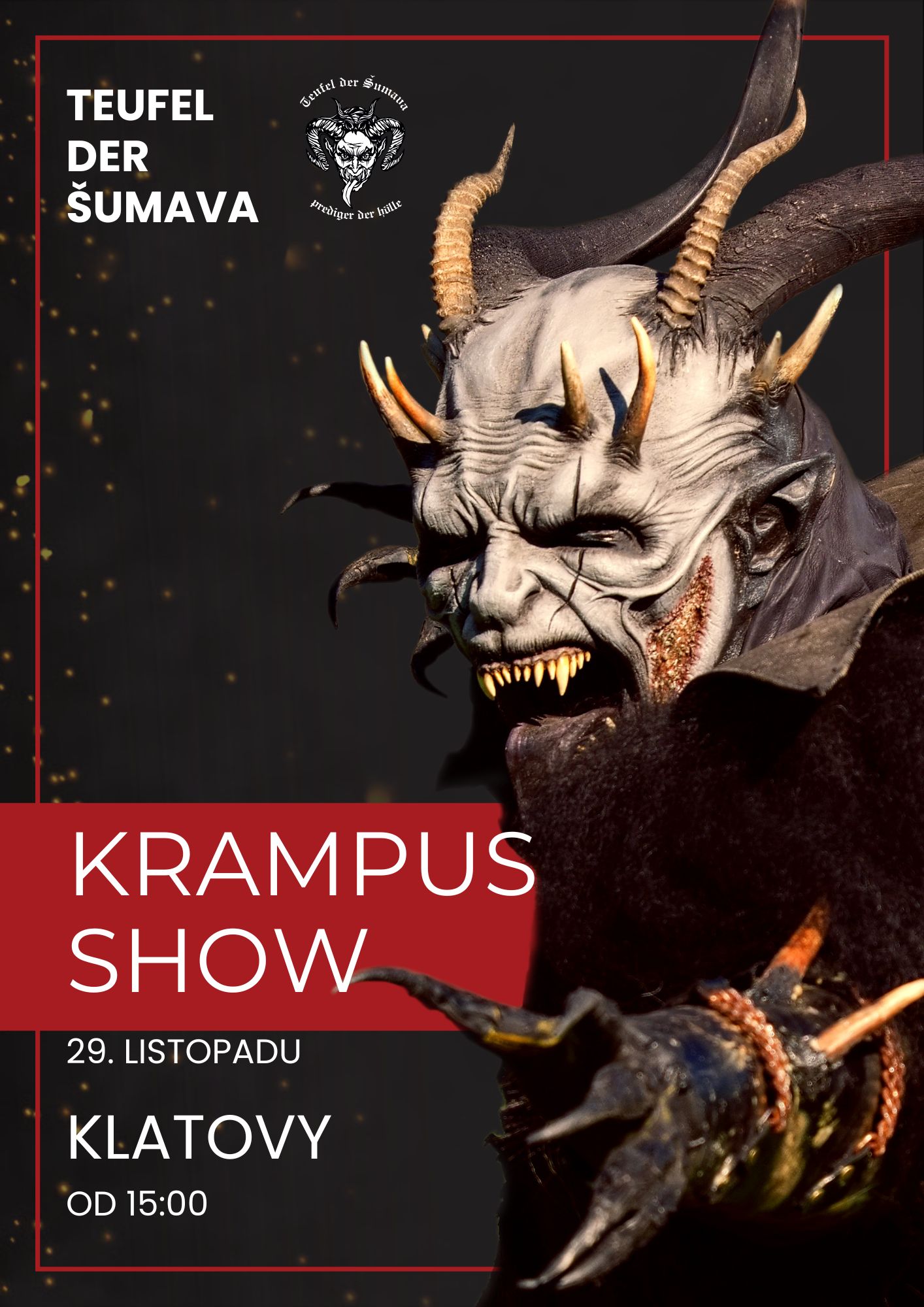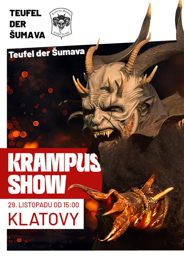Pojďte s námi na Sokolský stadion v Klatovech objevit kouzlo Krampusu se skupinou Teufel der Šumava,která pro Vás zahraje Krampus pohádku,po které se i Vaše děti zbaví strachu a obav z čertů a také díky tomu pochopíte tradici Rakouského Krampusu z čehož vlastně tento příběh vzešel.Představí Vám i své hosty z Rakouska a Německa v počtu až 110 Krampusáků a Teufel der Šumava 30 členů.