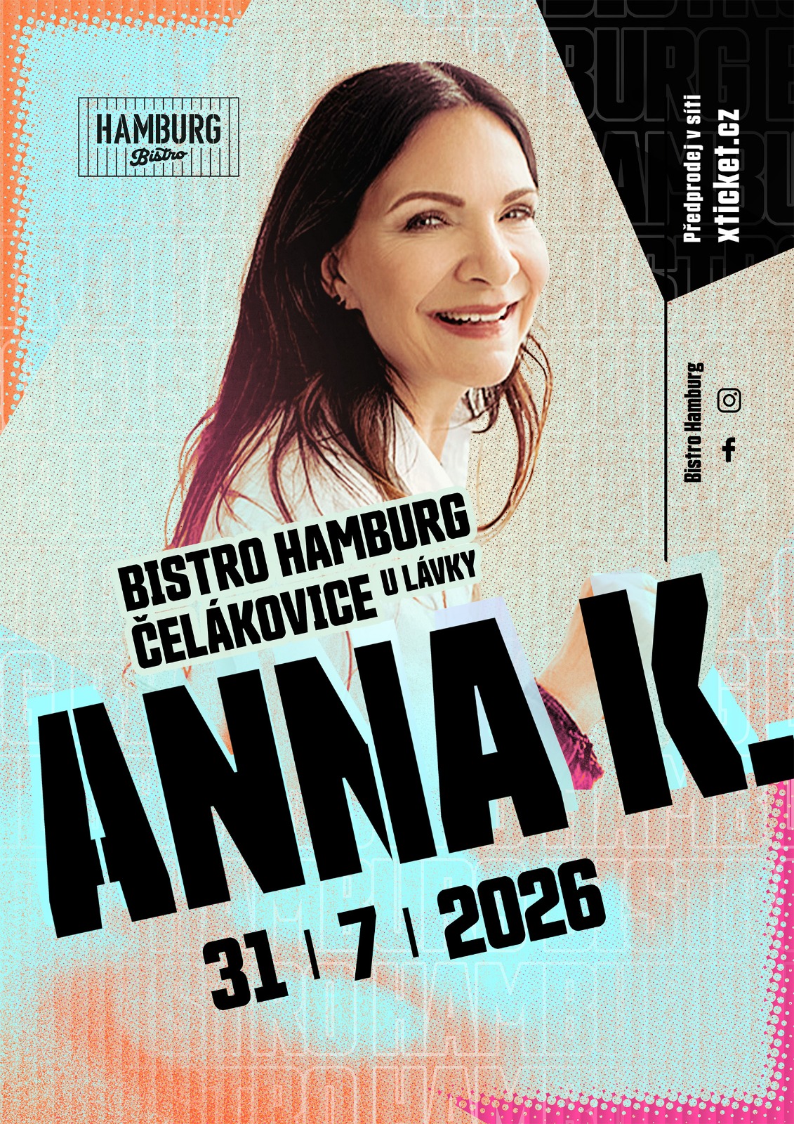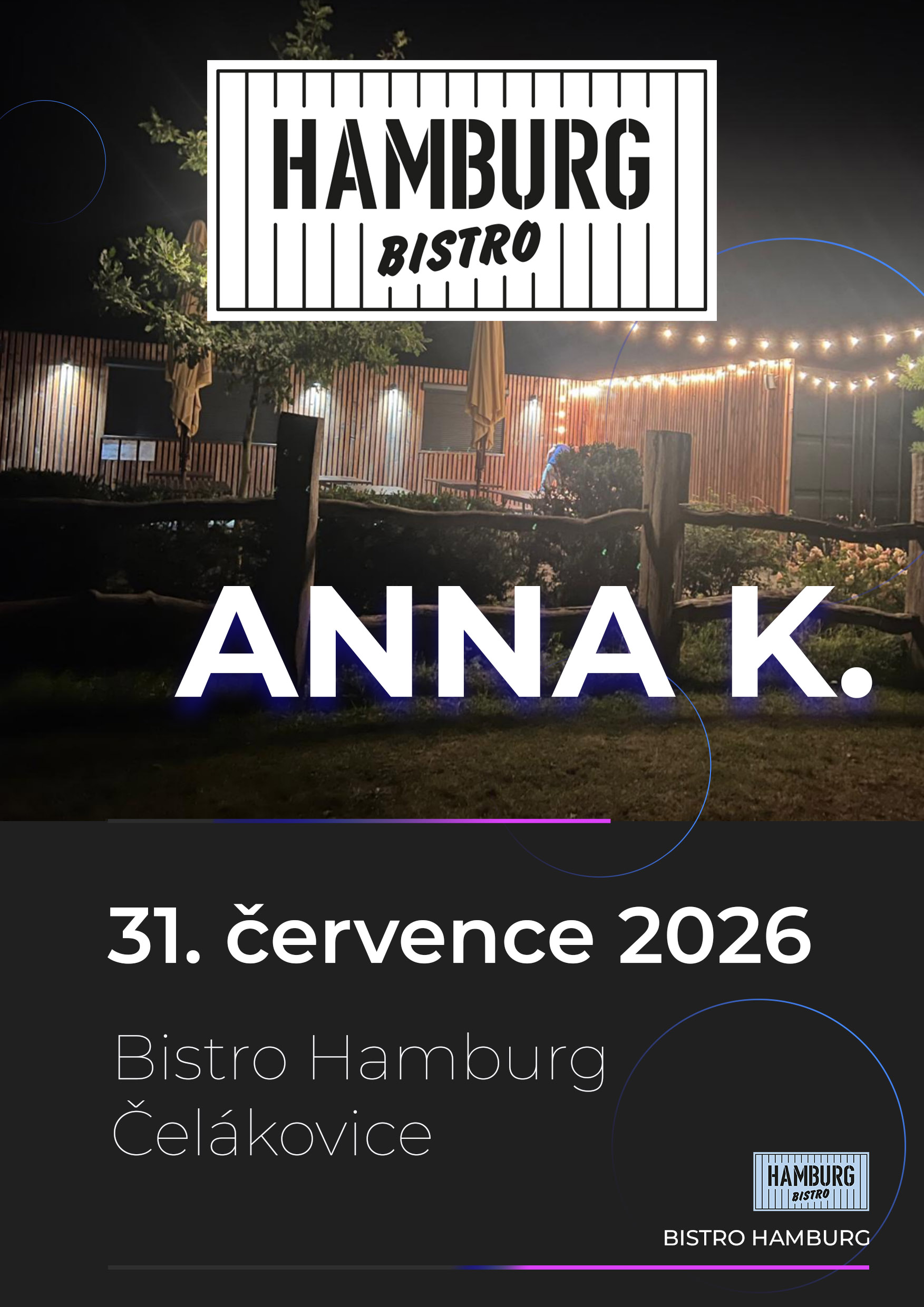 Anna K. dorazí 31. července 2026 do nové koncertní lokality u Bistro Hamburg v Čelákovicích, kde vystoupí v malebném prostředí přímo u řeky Labe. Scéna situovaná u lávky přes Labe vytváří výjimečnou atmosféru, která skvěle ladí s energií a intenzitou jejích koncertů. Nové místo nabízí propojení hudby s přírodou a stává se jedním z nejatraktivnějších letních kulturních bodů v regionu.