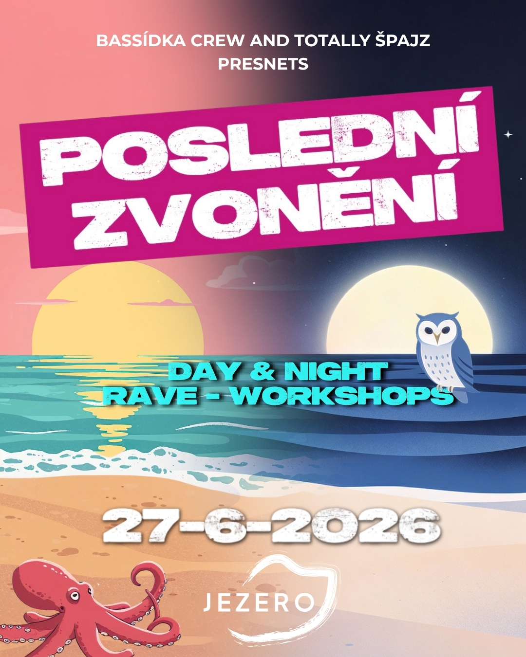 Přes den tě bude bavit projekt Totally Špajz, který rozjede svojí denní misi - jako chobotnice roztáhne chapadla napříč pestrou paletou současné elektronické hudby. Za soumraku tě pak naláká soví houkání na noční drum and bassovou bojovku s DJs z BASSídka crew a Unity Rage.