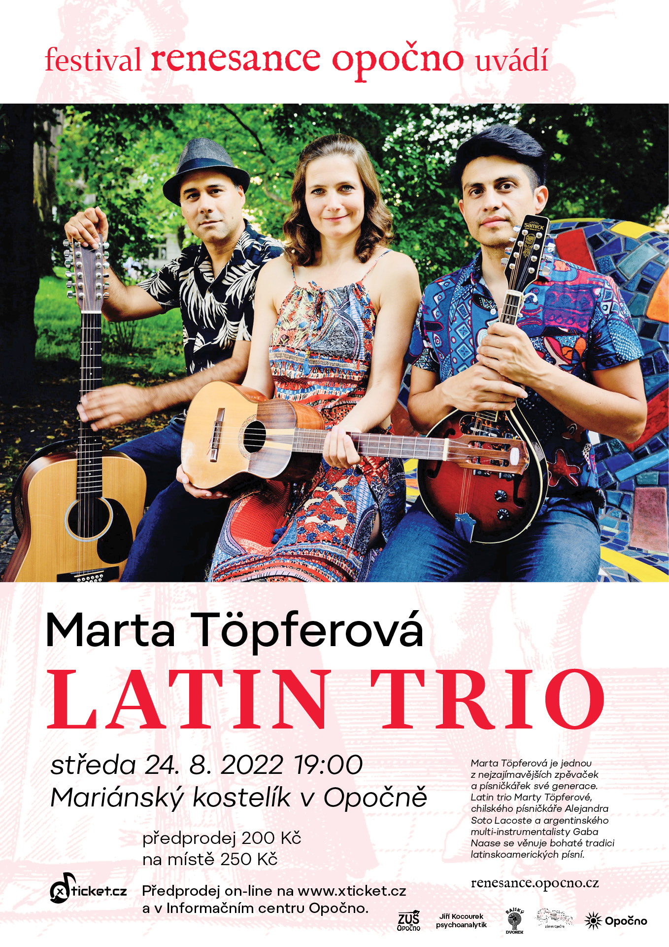 Marta Töpferová je jednou z nejzajímavějších zpěvaček a písničkářek své generace. Latin trio zpěvačky Marty Töpferové, chilského písničkáře Alejandra Soto Lacoste a argentinského multi-instrumentalisty Gaba Naase se věnuje bohaté tradici latinskoamerických písní.