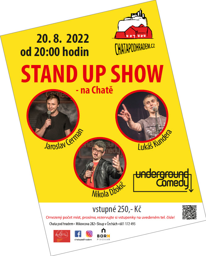 Osvědčený formát tří komiků na Chatě pod hradem ve Sloupu v Čechách. Letos to budou: Jaroslav Cerman, Lukáš Kundera a Nikola Džokič. Vstupné lze zakoupit přímo na Chatě. Těšíme se!