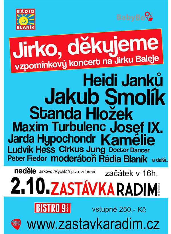 Vzpomínkový koncert na Jirku Baleje. Vystoupí Heidi Janků, Jakub Smolík, Standa Hložek, Maxim Turbulenc, Josef IX., Jarda Hypochondr, Kamélie, Ludvík Hess a mnoho dalších